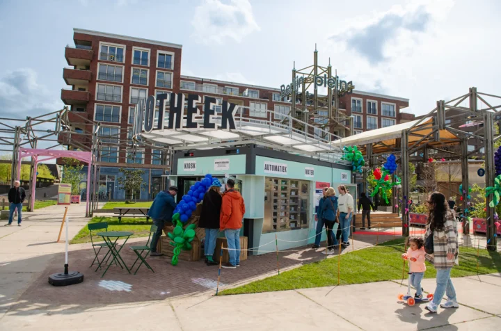 Op het midden van ons plein staat de Pleinotheek: een buurtuitleen, kiosk en bibliotheek ineen. Aan de voorkant van de Pleinotheek zit de kiosk. Hier kunnen mensen een kopje kofe halen en een praatje maken met een buurtbewoner achter de balie. De deuren aan de achterkant van de Pleinotheek kunnen wagenwijd open. Hier is de Buurtuitleen waar kinderen en volwassenen spullen en spelletjes kunnen lenen om te gebruiken op het plein. Aan de zijkant van de Pleinotheek zitten o.a. een automatiek waar mensen producten kunnen kopen en een expositieraam, waar kunstenaars en creatieven uit de buurt hun producten of ideeën kunnen aanbieden.