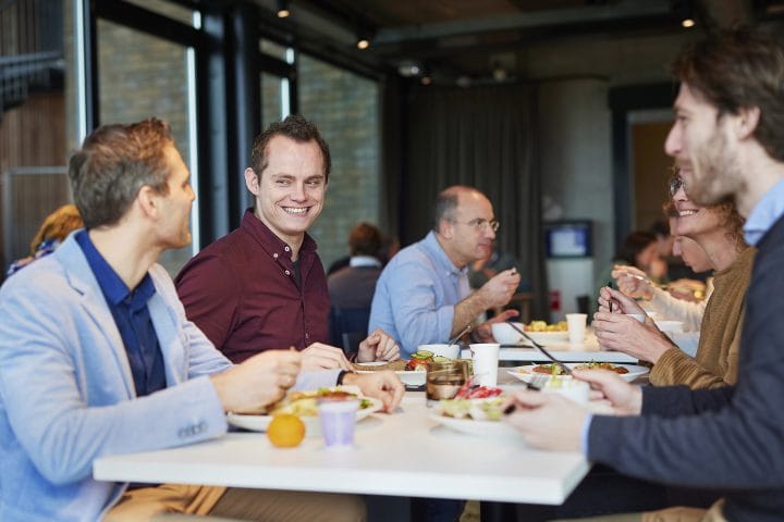 De brasserie serveert elke middag een gratis luxe lunch, dus je kunt je broodtrommel thuislaten. De week beginnen we met een stand-up (of je nu op kantoor of thuis bent) en sluiten we af met een gezellige borrel in de brasserie.